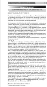 Segundo o decreto, o TCE terá acesso à movimentação financeira, contas bancárias, inclusive de aplicações financeiras, de titularidade da Câmara de Cruzeiro do Sul durante o período de 01/01/2019 à 31/12/2019.