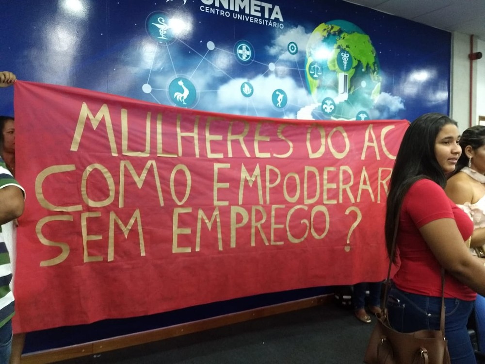 Antes da ministra falar, um grupo de mulheres organizou um ato com uma faixa questionando como a mulher poderia ser empoderada sem emprego.