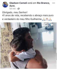 O governador Gladson Cameli comemora nesta terça-feira (26) o seu aniversário. Os 41 anos de vida foi celebrado com uma postagem em seu perfil no Facebook, com uma foto abraçando o seu filho Guilherme.