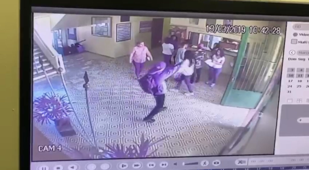 Uma câmera de segurança registrou o momento em que Guilherme Taucci Monteiro entra na Escola Estadual Raul Brasil, em Suzano, e atira em quem estava logo após a porta de entrada. O vídeo acima mostra o momento em que Monteiro entra na escola, saca a arma e aponta para as vítimas.