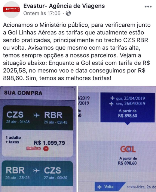 No site da empresa, uma passagem de ida e volta para a capital Rio Branco, que dura cerca de 40 minutos, chegou a custar aos cruzeirenses em torno de R$ 2025,58. A mesma passagem, na mesma data, eram oferecidas pela empresa (Evastur) por um outro valor bem inferior ao ofertado pela Gol.