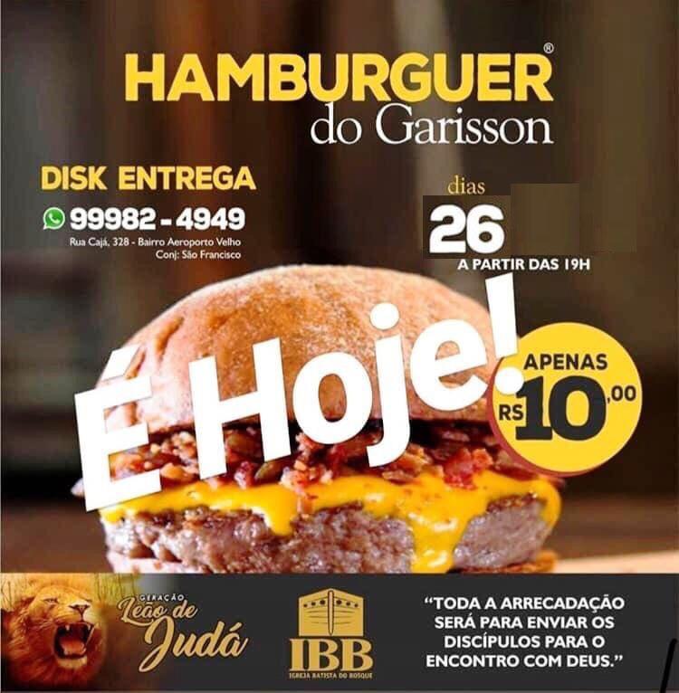 Visando ajudar o próximo, através da arrecadação de fundos para que pessoas possam participar do “Encontro com Deus”, evento realizado por igrejas evangélicas, a Igreja Batista do Bosque (IBB), através da ‘Geração Leão de Judá‘ inovaram, e estarão oferecendo na noite desta sexta-feira (26), um serviço de ‘Disk Entrega de Hamburguer’, para toda a cidade de Cruzeiro do Sul, no valor de apenas R$10.