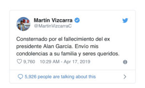 O atual presidente do Peru, Martín Vizcarra, publicou em rede social uma mensagem de condolências para os familiares e amigos.