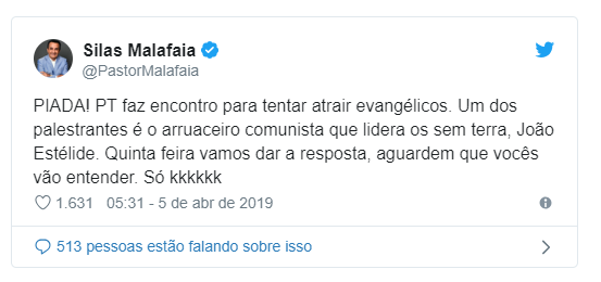 Ao tomar conhecimento deste encontro, o pastor Silas Malafaia usou suas redes sociais para criticá-lo. “PIADA! PT faz encontro para tentar atrair evangélicos. Um dos palestrantes é o arruaceiro comunista que lidera os sem terra, João Stélide”, disse.