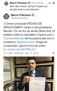 O vice-líder do governo no Congresso, o deputado federal Pastor Marco Feliciano (PODE-SP), entrou com um pedido de impeachmentcontra o vice-presidente Hamilton Mourão. O pastor acusa o general da reserva de “conduta indecorosa, desonrosa e indigna” e de “conspirar” para conseguir o cargo de Jair Bolsonaro.