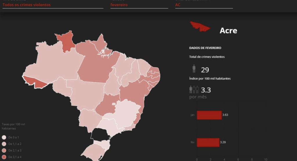 Mesmo com uma queda de 24,7% no número de assassinatos nos dois primeiros meses deste ano em comparação com o mesmo período do ano passado, o Acre segue com a segunda maior taxa de mortes do país. O Acre fica atrás apenas de Roraima, com uma taxa de 3.8.
