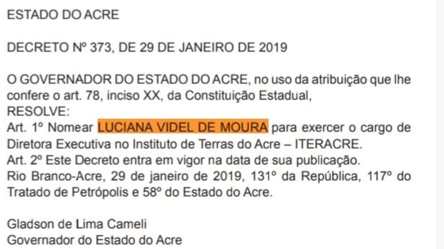 A reportagem foi informada por servidores que Luciana já não trabalha mais no Instituto de Terras. E não localizamos o diretor-presidente do iteracre para falar a respeito.