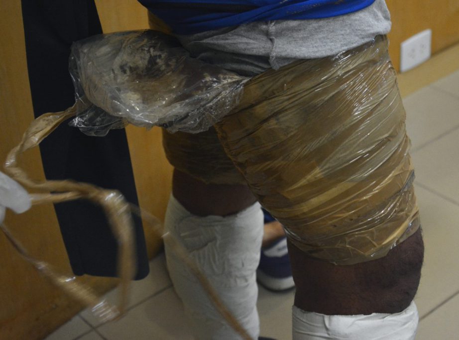 Ao revistá-lo, a equipe percebeu que havia algo preso às pernas e virilha. Foi então que encontraram os seis pacotes, presos com fita adesiva. Após a realização de testes, ficou constatado que o material se tratava de 3 quilos de cocaína, envoltos com pó de café.