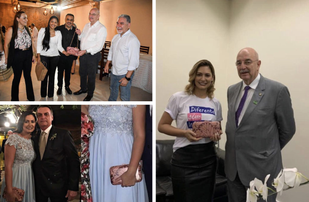 A primeira-dama do Brasil, Michelle Bolsonaro, usou como acessório a bolsa de marchetaria dada pela primeira-dama de Cruzeiro do Sul, Keiliane Cordeiro. A esposa do presidente apareceu com peça durante no casamento do enteado, o deputado federal Eduardo Bolsonaro.