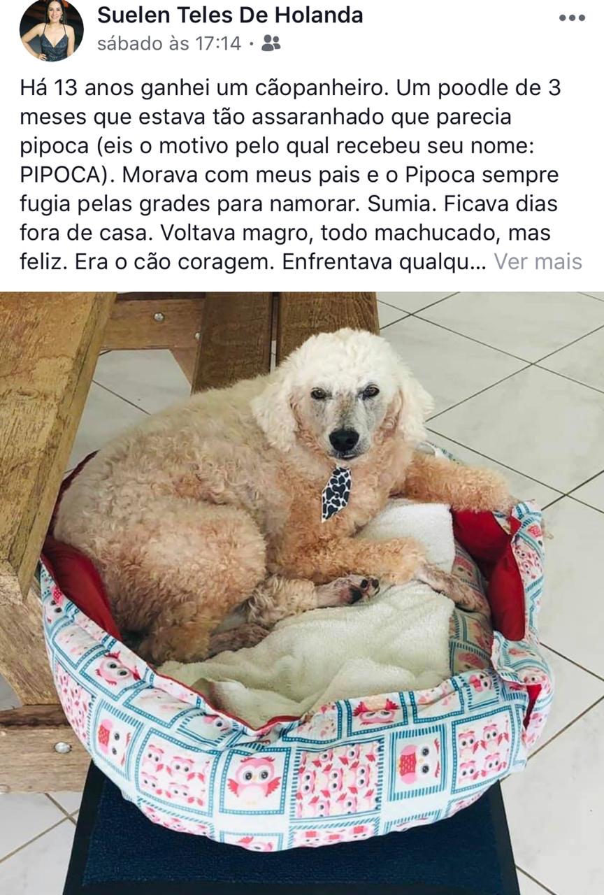 “Hoje, 25 de maio, às 7h45min14seg, um ser Desumano tirou o pipoca de mim da forma mais cruel que vocês possam imaginar. Tinha uns 3 minutos que ele tinha saído. Nas gravações da câmera vemos o animal dirigindo uma caminhonete perseguindo o Pipoca lentamente e passando o carro por cima”, relata Suelen Teles.