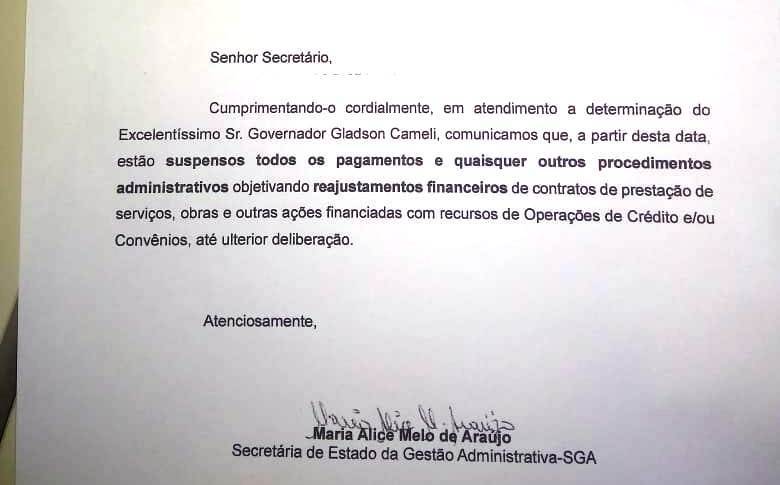 Um comunicado, assinado pela secretária de Gestão Administrativa Maria Alice, informa que “estão suspensos todos os pagamentos e quaisquer procedimentos administrativos”.
