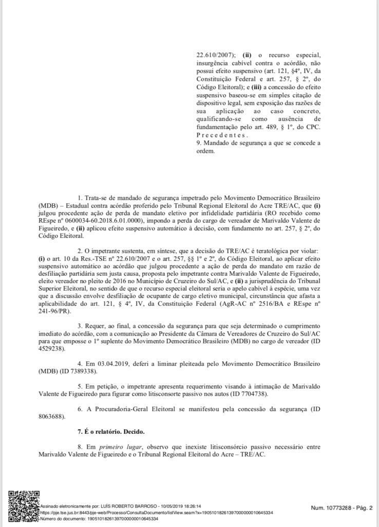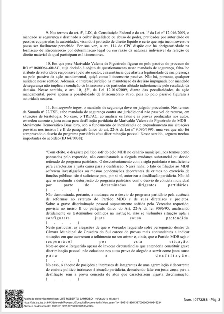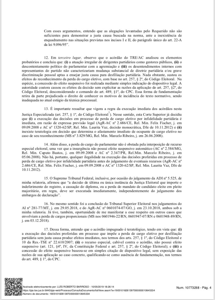 “O vereador não teria comprovado o desvio do programa partidário e/ou discriminação pessoal”, afirmou Barroso em sua decisão. Assim, não houve motivos concretos que justificasse que o vereador trocasse de partido e ficou comprovado sua infidelidade.