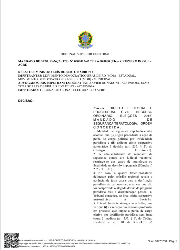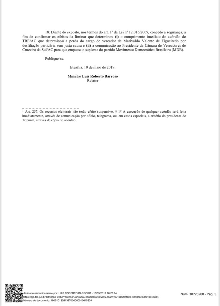 Após recurso final, pedido pelo, agora, ex-vereador Marivaldo Figueiredo, de Cruzeiro do Sul, o Tribunal Superior Eleitoral (TSE) manteve, nesta sexta-feira, 10, decisão que determinou afastamento imediato do parlamentar, por infidelidade partidária.