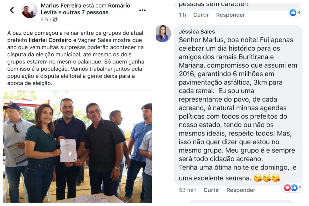 Após postagem feita no Facebook pelo jornalista Marlus Ferreira, insinuando que o grupo da família Sales estaria no mesmo palanque que o prefeito de Cruzeiro do Sul, Ilderlei Cordeiro no próximo ano, a deputada federal Jéssica Sales tratou logo de desmentir essa possível aliança.