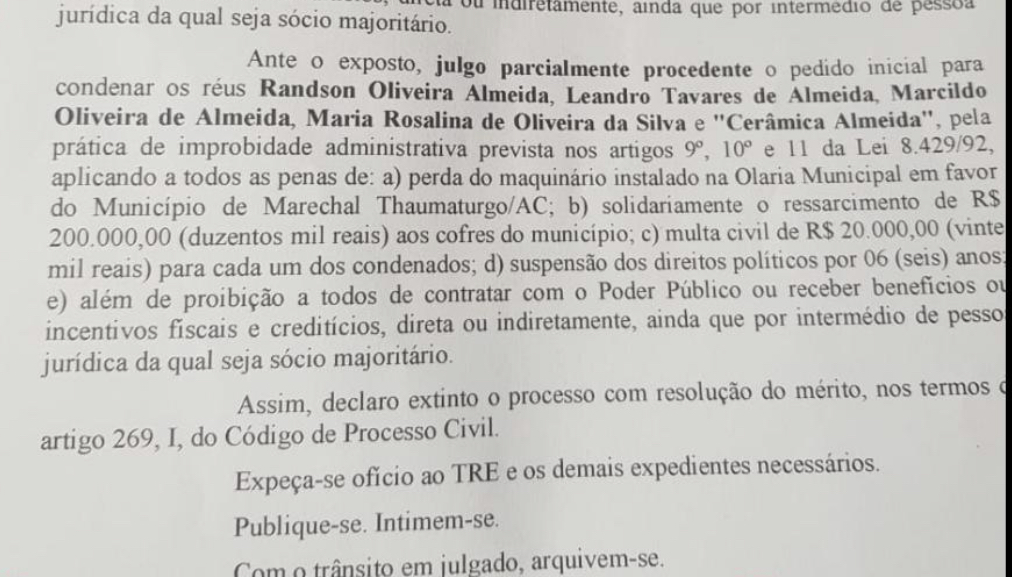 Uma decisão da 2° Vara Cível de Cruzeiro do Sul determinou o bloqueio parcial de bens do ex-prefeito de Marechal Thaumaturgo Randson Almeida (MDB). A ação tenta ressarcir um prejuízo da casa dos 200 mil reais que Randson e sua trupe causaram aos cofres públicos ao utilizarem tijolos da olaria municipal para benefício próprio.