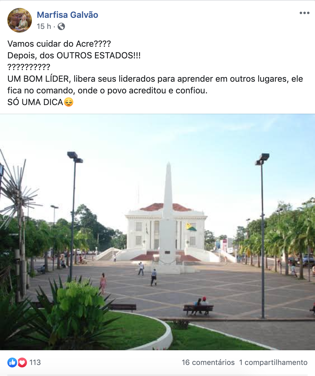 A ex-deputada federal Marfisa Galvão deu uma alfinetada, ao que tudo indica, para o governador Gladson Cameli. Em sua página do Facebook, a ex-parlamentar falou: “Vamos cuidar do Acre???? Depois, dos OUTROS ESTADOS!!! UM BOM LÍDER, libera seus liderados para aprender em outros lugares, ele fica no comando, onde o povo acreditou e confiou. SÓ UMA DICA?”.