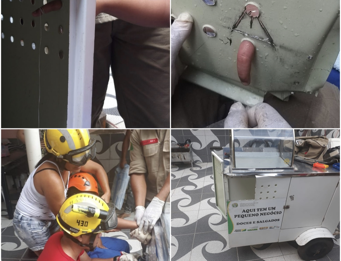 Um menino de 7 anos ficou quase uma hora com o dedo preso no carrinho de lanche da mãe e precisou ser socorrido pelo Corpo de Bombeiros. O caso ocorreu na tarde deste domingo (27), no bairro da Paz, em Rio Branco.