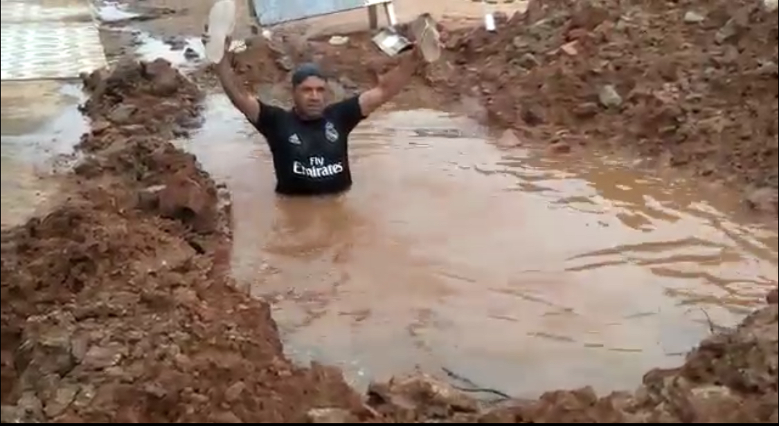 Nas imagens é possível ver a dimensão e a profundidade do buraco, já que a água bate acima de sua cintura. O buraco, segundo o morador, fica na Avenida Marechal Deodoro.