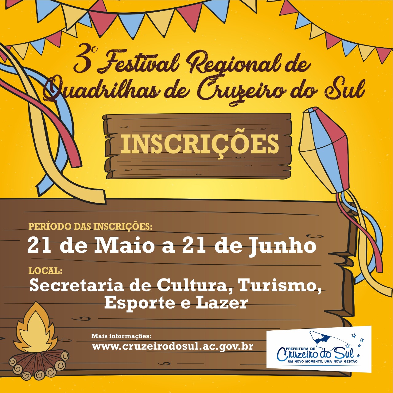 A Prefeitura de Cruzeiro do Sul, através da Secretaria Municipal de Cultura, realizará nos dias 12, 13 e 14 de julho, na praça do Centro Cultural, a 3° edição do Festival Regional de Quadrilhas. Neste ano, o evento contará com premiações, em duas categorias: municipal e regional. O secretário de cultura, Aldemir Maciel, enfatizou o entusiamo na realização do evento, já que desde que foi criado, o sucesso tem sido notório por parte da população cruzeirense.
