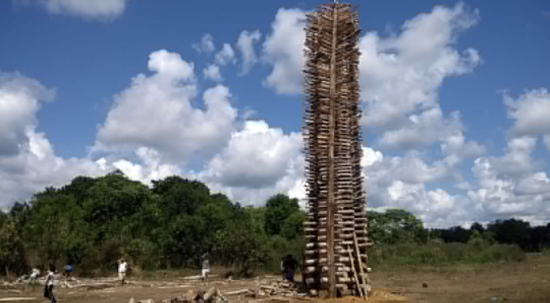 Para empilhar as hastes de lenha até chegar a altura de 13 metros, os moradores formam uma espécie de torre humana e passam as peças de mão em mão até chegar ao topo. É um trabalho demorado que eles fazem com muita atenção para evitar qualquer incidente.