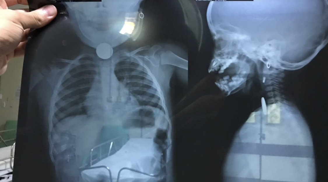 O caso ocorreu na noite de quarta-feira (12) e o objeto só foi retirado nesta quinta-feira (13), depois que os pais levaram a menina em uma clínica particular. O raio X mostra onde a moeda ficou localizada.