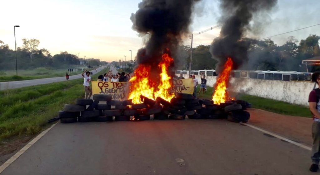 Um grupo de estudantes e sindicalizados, liderados pelo Sindicato dos Bancários do Acre (Seeb-AC), fechou um trecho da BR-364, impedindo a passagem dos coletivos nas primeiras horas do dia e também de mercadorias.