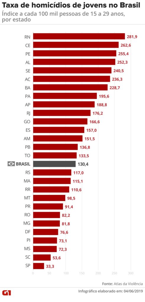 Um outro dado mostra o quão grave é a situação: os homicídios foram a causa de 51,8% de todas as mortes na faixa de 15 a 19 anos. Em 15 estados, a taxa de jovens mortos foi superior à média nacional.