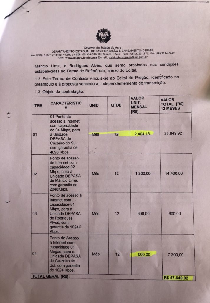 No contrato apresentados por José Maria Freitas, o valor de 57 mil reais refere-se ao pagamento anual, e não mensal, no total de quatro unidades, administrativas e operacionais do DEPASA. O ex-gestor afirmou que a empresa UNONET, prestadora do serviço, venceu o processo licitatório aberto a todas empresas de Cruzeiro do Sul, e que na época a empresa OI (com a qual o atual governo fechou contrato de internet) não tinha disponibilidade para prestar o serviço na região. O processo licitatório foi publicado no Diário Oficial.