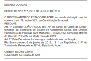 João Paulo Bittar, filho do Senador Márcio Bittar (MDB) foi exonerado pelo governador Gladson Cameli do cargo de Chefe de Departamento da Secretaria de Estado de Assistência Social, dos Direitos Humanos e de Políticas para Mulheres (SEASDH), onde recebia como salários valores de cerca de 10 mil reais.