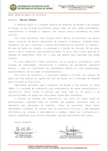 A direção do Hospital da Mulher e da Criança do Juruá (HMCJ) disse não haver omissão dos profissionais, que pudesse contribuir para os desfechos das gestações em questão. Segundo a instituição, as pacientes estão sendo devidamente tratadas, de acordo com os protocolos clínicos e sem qualquer deficiência em relação a medicamentos e exames.