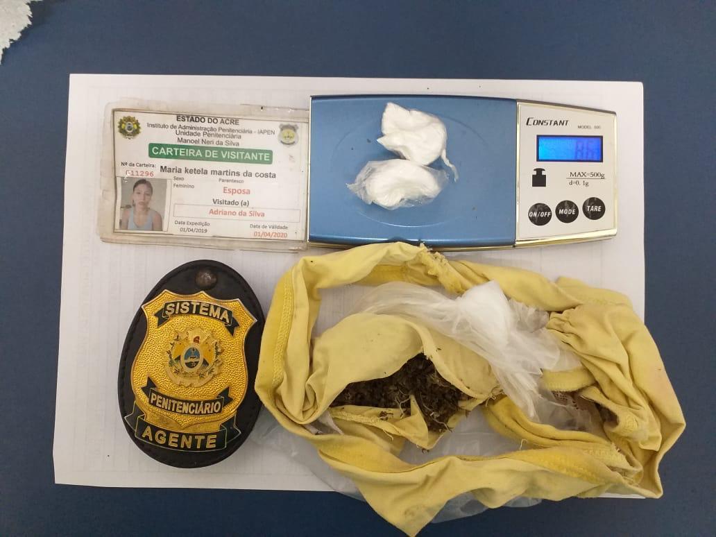 Agentes Penitenciários deram voz de prisão, na manhã deste sábado, 15, às visitantes Maria Ketela Martins da Costa e J. do N. S., que tentavam entrar no presídio de Cruzeiro Sul com 86 gramas de uma substância aparentando ser cocaína e 47 gramas de outra substância aparentando ser maconha, respectivamente.