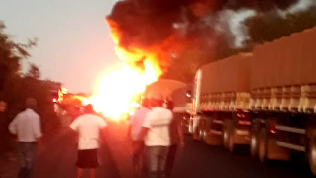 Após a colisão, o caminhão tanque explodiu e o motorista morreu carbonizado. O outro motorista da carreta não se feriu.