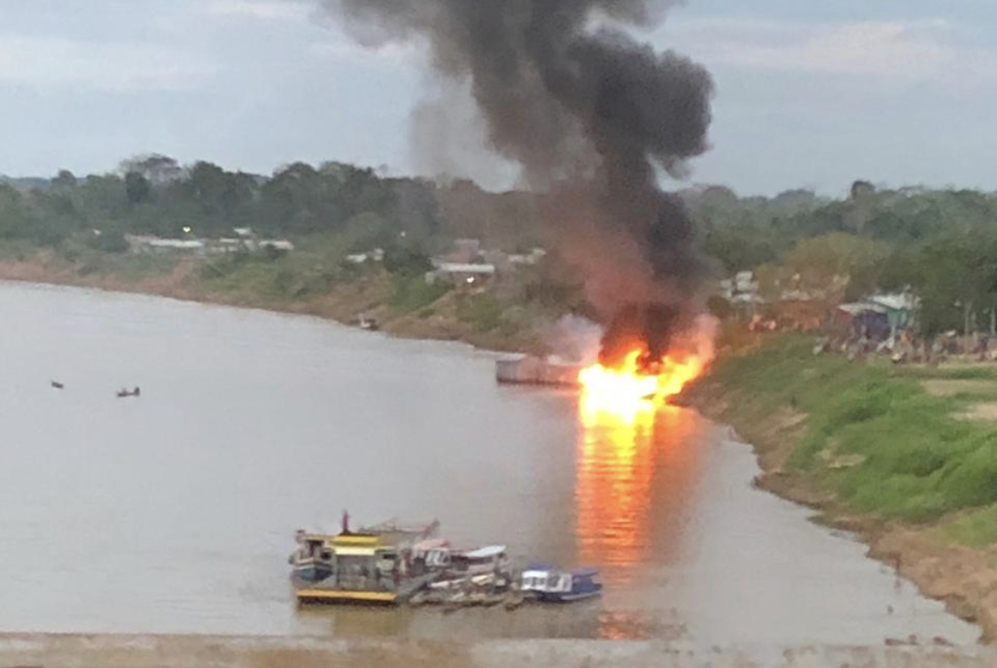 Um barco está em chamas às margens do Rio Juruá, no porto de Cruzeiro do Sul. Ainda não se sabe o motivo que ocasional o incidente na noite desta sexta-feira, 7.