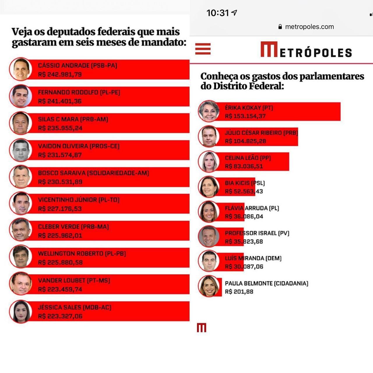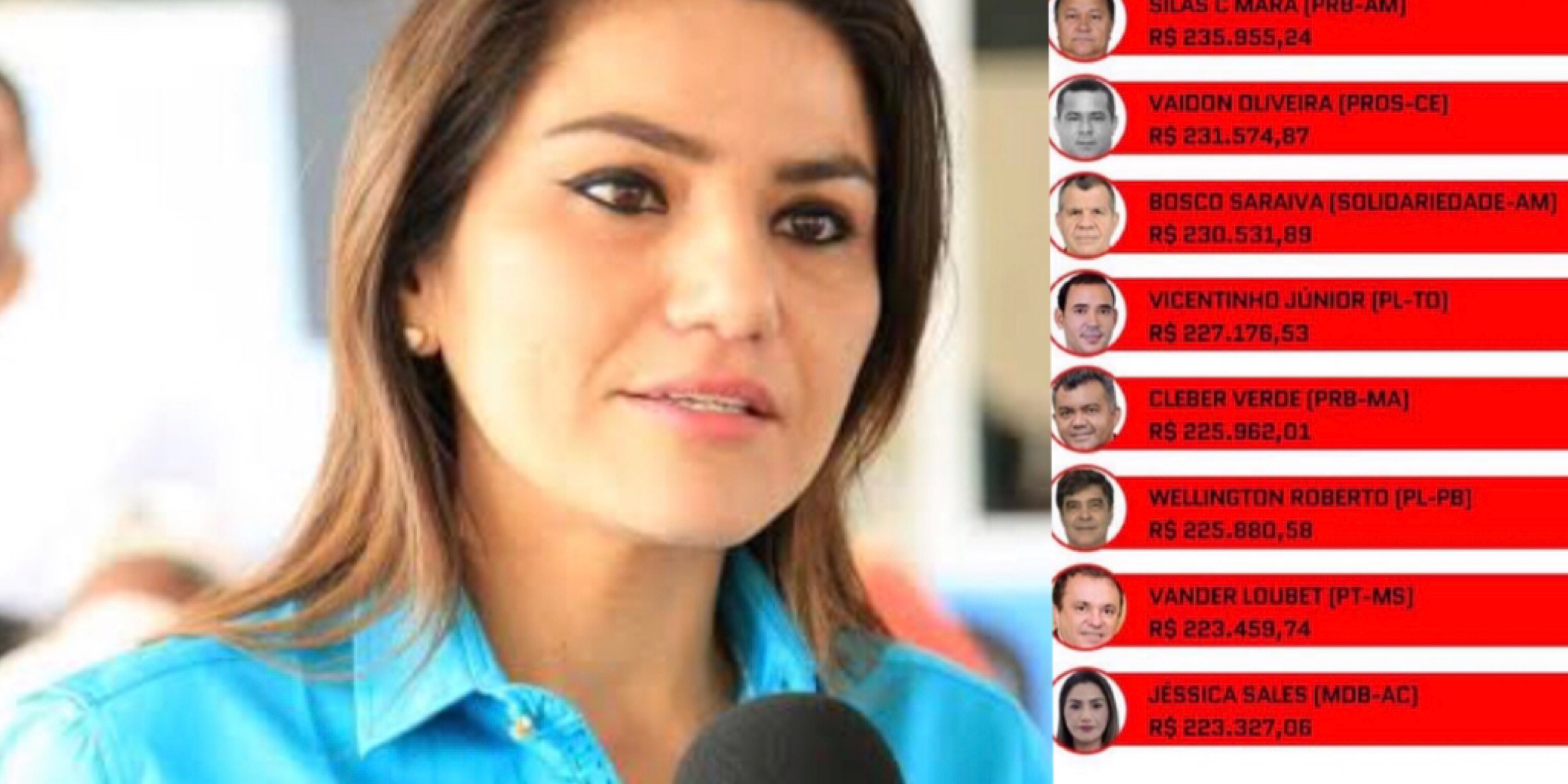 Por enquanto, quem lidera a lista dos deputados que mais usaram o dinheiro público é Cássio Andrade (PSB-BA). Ele foi o que mais gastou da cota parlamentar, R$ 242.981,79. O vice campeão na lista de gastos foi o deputado Fernando Rodolfo (PL-PE), com R$ 241.401,36, e o terceiro colocado neste ranking da vergonha é um velho conhecido dos acreanos: o deputado federal Silas Câmara (PRB-AM). O marido da ex-deputada federal pelo Acre Antônia Lúcia é o terceiro colocado com gastos de R$ 235.955, 24. O mais econômico foi do DF, Paula Belmonte (Cidadania) tem apenas R$ 201,88 registrados até agora. Jéssica Sales é a décima colocada nesta lista vergonhosa.