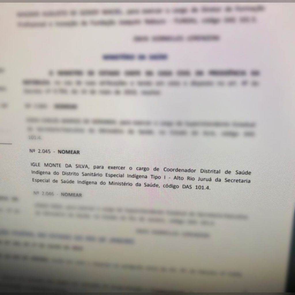 O decreto que nomeia a assistente social Iglê Monte da Silva como nova coordenadora do Distrito Sanitário Indígena do Juruá foi divulgado nesta quinta-feira, 18, no Diário Oficial da União. A nova coordenadora foi indicada pelo ex-prefeito de Cruzeiro do Sul e ex-articulador de governo Vagner Sales.