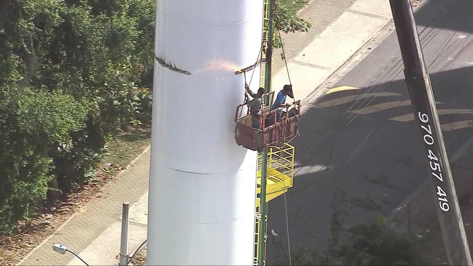 Um flagrante registrado pelo Globocop no início da tarde desta quarta-feira (3) mostrou criminosos usando dois guindastes para tentar roubar um reservatório de água do condomínio Minha Casa Minha Vida, em Triagem, na Zona Norte do Rio.