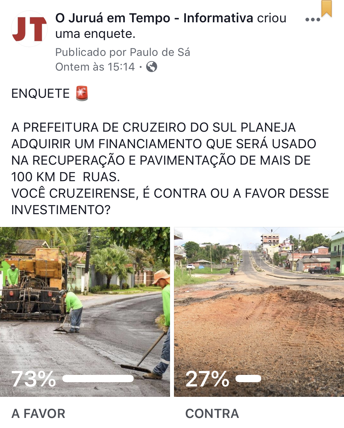 Os números sobre o apoio da população à proposta surgiram de uma enquete feita pelo “O Juruá Em Tempo”, em sua página do Facebook. A enquete permaneceu durante 24 horas, em que 73% do público foi favorável, e apenas 27% votou contra.