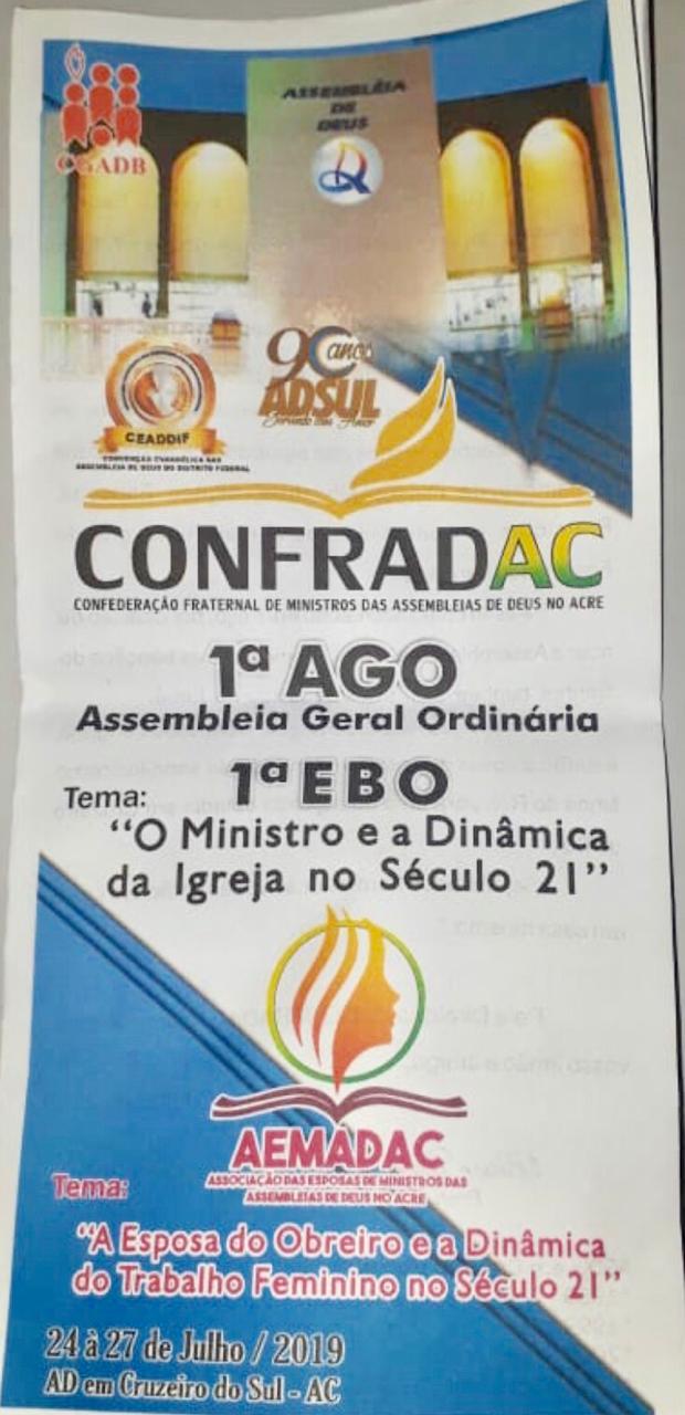 Começa nesta quarta-feira, 24, a 1a Assembleia Geral Ordinária da Confederação Fraternal de Ministros das Assembleias de Deus no Acre (Confradac). O evento vai até sábado, 27, em Cruzeiro do Sul.