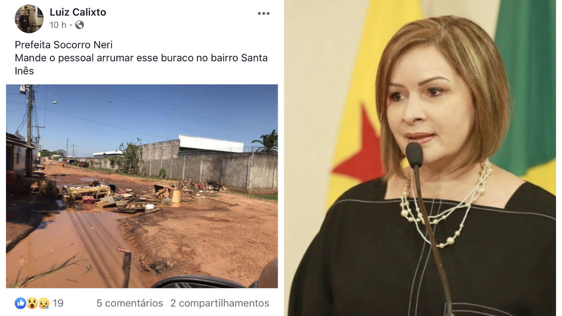 O ex-deputado Luiz Calixto postou a foto de uma no bairro Santa Inês, em Rio Branco, e suplicou que a prefeita Socorro Neri pavimente a via.