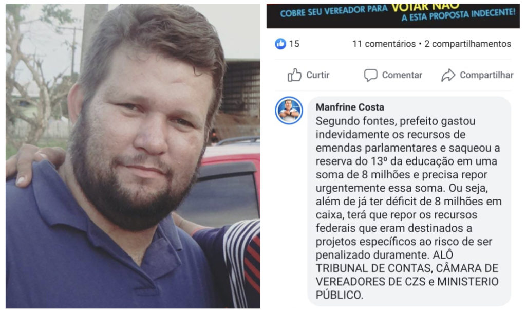 Manfrine afirmou em uma postagem que o prefeito gastou indevidamente os recursos de emendas parlamentares e saqueou a reserva do décimo terceiro da educação e precisa repor essa soma. Ou seja, os recursos que o prefeito atual busca seria para tapar rombos, segundo o ex-secretário.