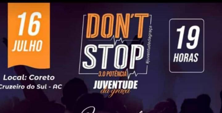 A Igreja Internacional da Graça realiza nesta terça-feira, 17, um grande evento musical, o “Don’t Stop 3.0”, na Praça do Centro Cultural de Cruzeiro do Sul. O evento reúne cantores e ministérios das igrejas evangélicas do município, além da atração principal, o Pastor Jamisson Santana.