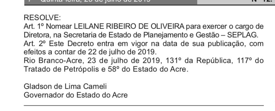 A agente administrativa da Polícia Federal, Leilane Ribeiro de Oliveira, 38 anos, natural de Cruzeiro do Sul, filiada ao partido Progressista, foi nomeada nesta quinta-feira (25), para exercer de diretora, na Secretaria de Estado de Planejamento e Gestão – SEPLAG.