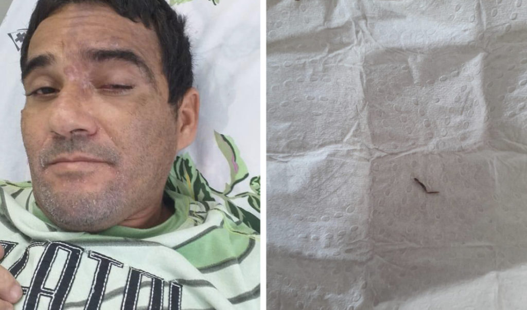 “Meu pai estava com o rosto cheio de bolhas, o médico não analisou o olho dele e já disse que era cobreiro. Eu ainda falei que tinha sido uma caba que ferrou ele. Ele ficou de voltar no outro dia, mas já mandou outra médica. Meu pai teve alta, passou todos esses dias em casa, e na sexta-feira voltou novamente no hospital, após termos pago uma consulta com o mesmo médico, aí ele encontrou a perna do inseto no olho dele”, contou a filha do paciente.