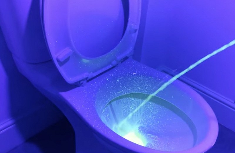 Durante as gravações feitas no mesmo banheiro, a equipe usou luz ultravioleta para descobrir até onde a urina realmente espirra e provou que as gotas invisíveis voam pra todo lado.