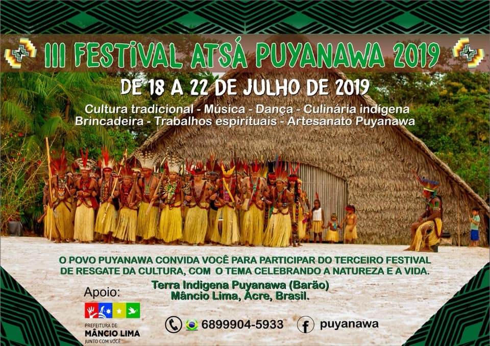 O povo indígena Puyanawa está em fase de preparo para o III Festival Atsá Puyanawa 2019. Com o tema “Celebrando a Natureza e a Vida”, acontece de 18 a 22 de julho, na Terra Indígena do Povo Puyanawa, em Mâncio Lima,o Festival da Macaxeira. Este momento é considerado um ponto de encontro festivo da comunidade indígena com suas raízes, visão de mundo e tradições.