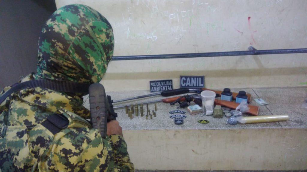 Com ele foram encontrados 1 (um) revólver, 1 (uma) espingarda, mais de R$ 4.700,00, 80g de cocaína e 148g de maconha, bem como outros materiais utilizados para prática de ilícitos, na BR 364 – Liberdade.