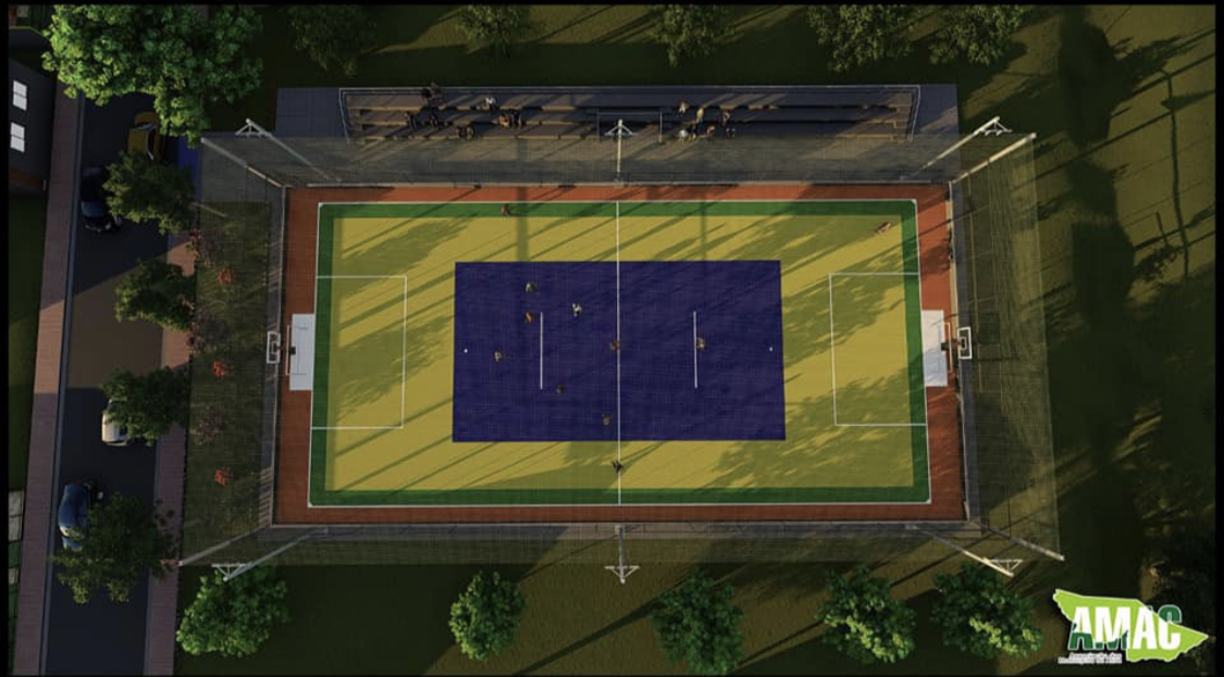 O projeto conta com: arquibancada com três lances para espectadores e espaço reservado para cadeira de rodas, proteção em alambrado e rede de nylon, no espaço foi elaborando para atender as práticas desportivas como futsal, voleibol e basquete .