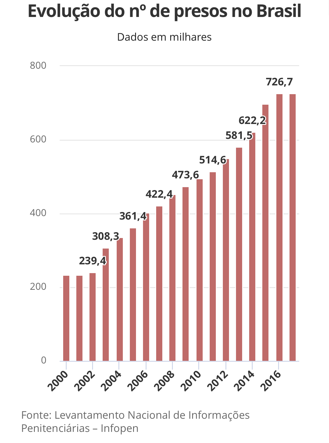 O relatório destaca ainda que a população prisional cresceu, em média, 7,1% ao ano. O número de presos saltou de 232 mil em 2000 para 726 mil em 2017. Ainda segundo o estudo faltam 303.112 vagas para atender a todos os presos. O déficit de vagas é maior no regime fechado, com uma necessidade superior a 114 mil vagas, seguido pelo regime provisório, no qual faltam mais de 95 mil vagas.