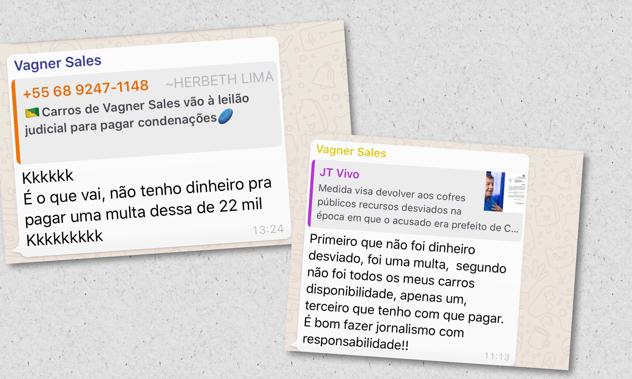 A forma debochada com a qual o ex-prefeito de Cruzeiro do Sul Vagner Sales trata a vida pública veio à lume mais uma vez. Em redes sociais e seus grupos, o ex-prefeito, ao tratar do noticiário sobre o leilão de carros de sua propriedade para o pagamento e ressarcimento de recursos públicos que teriam sido desviados à época em que ele era gestor da cidade, o próprio Vagner Sales veio à público com ironias, dizendo ter dinheiro suficiente para pagar eventuais condenações.