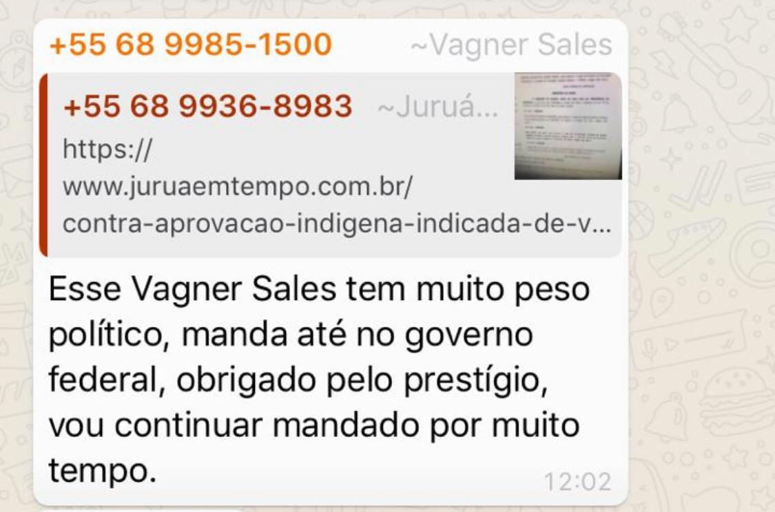 Após a matéria divulgada no site Juruá em Tempo intitulada “Contra aprovação indígena, indicada de Vagner é nomeada coordenadora do Dsei”, o ex-prefeito Vagner Sales não perdeu tempo e respondeu a publicação da matéria em um dos grupos de notícia do site.